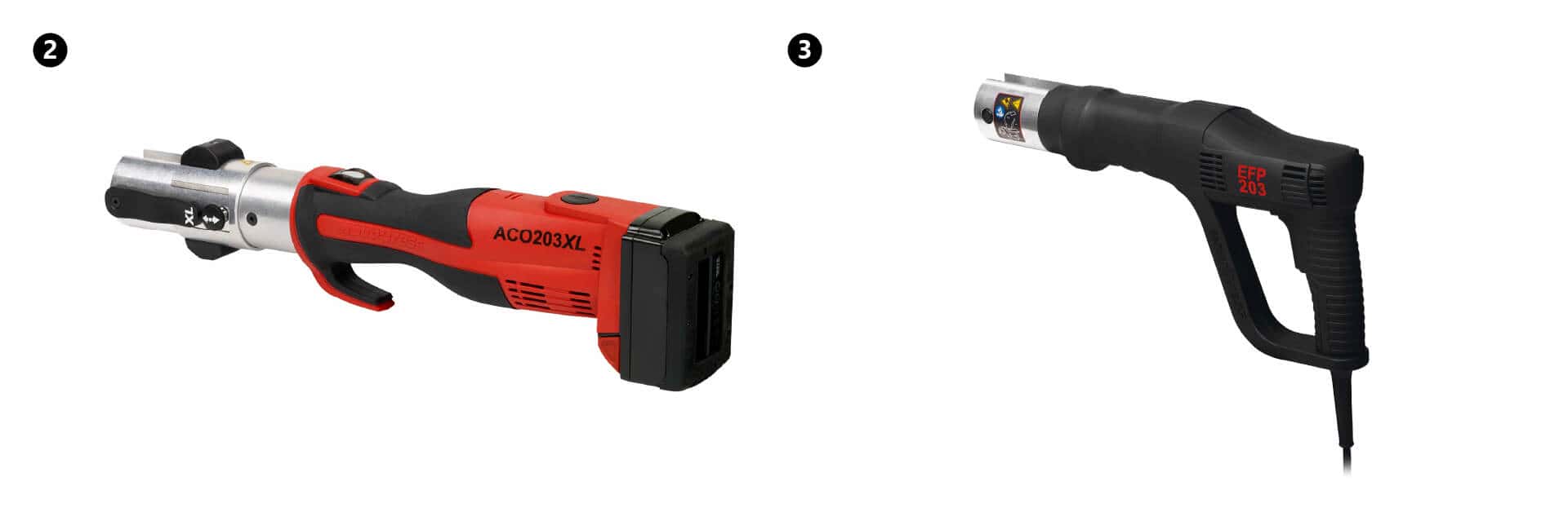 KAN‑therm ultraPRESS pipes 系统的管道和管件装置可允许手动电动便携的电池驱动的工具。所有工具都可套装和单件销售。